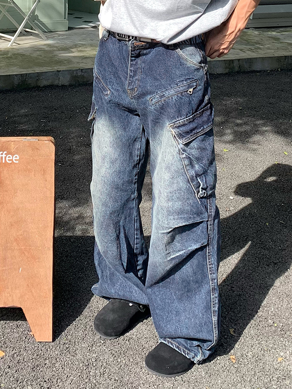 Verwaschene Herren-Cargojeans im Distressed-Look mit seitlichen großen Taschen