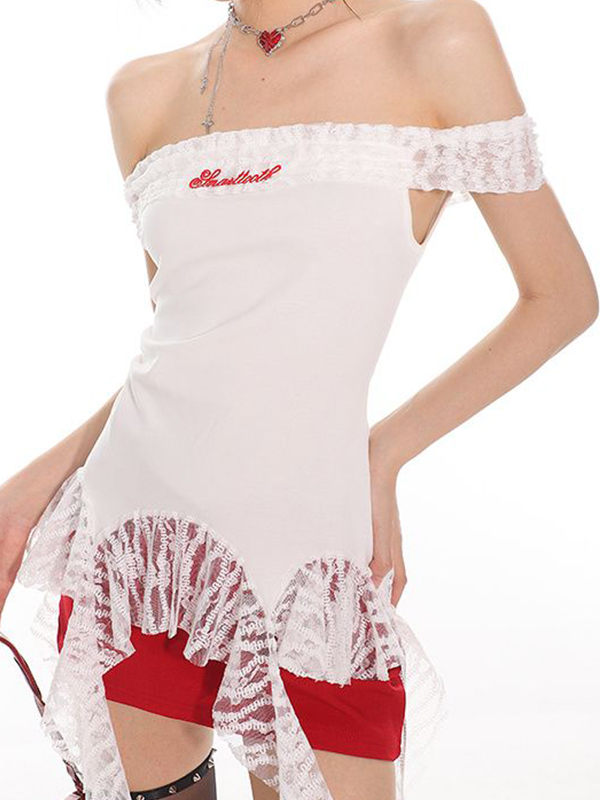 One-Shoulder-T-Shirt mit Spitzen-Print und kurzen Ärmeln