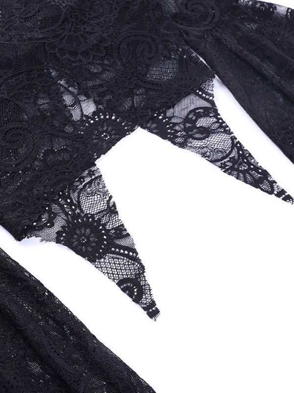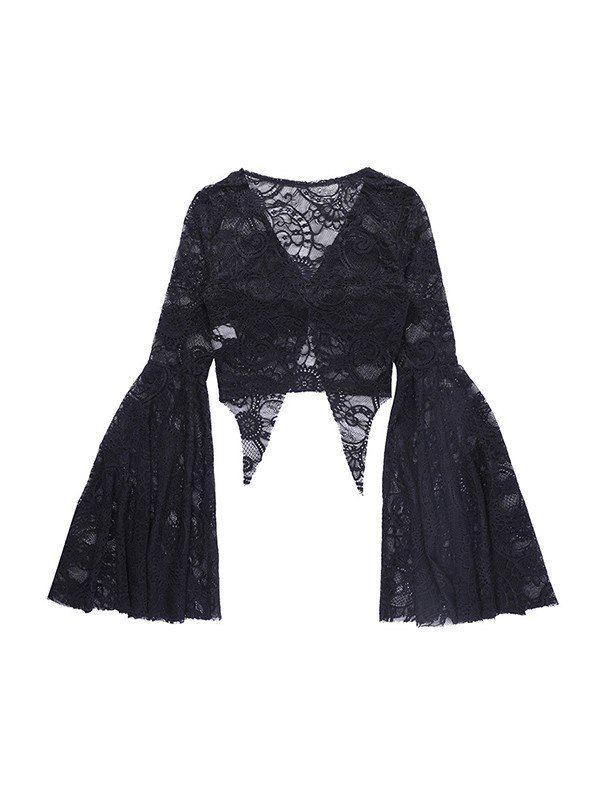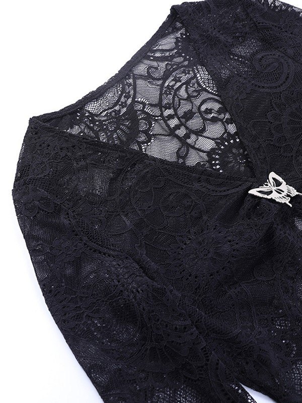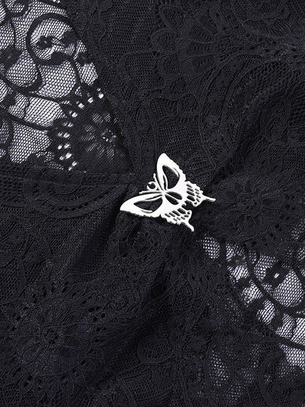 Beschreibung: Lassen Sie sich von diesen dunkel inspirierten Crop-Tops begeistern, wir sind besessen. Es besteht aus durchsichtigem Spitzenstoff und hat ein gefüttertes Detail auf der Brust. Mit Schmetterlingsanhänger aus Metall vorne, ausgestellten Bündchen und spitz zulaufendem Saum.