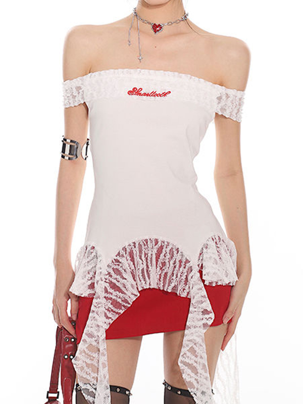 One-Shoulder-T-Shirt mit Spitzen-Print und kurzen Ärmeln