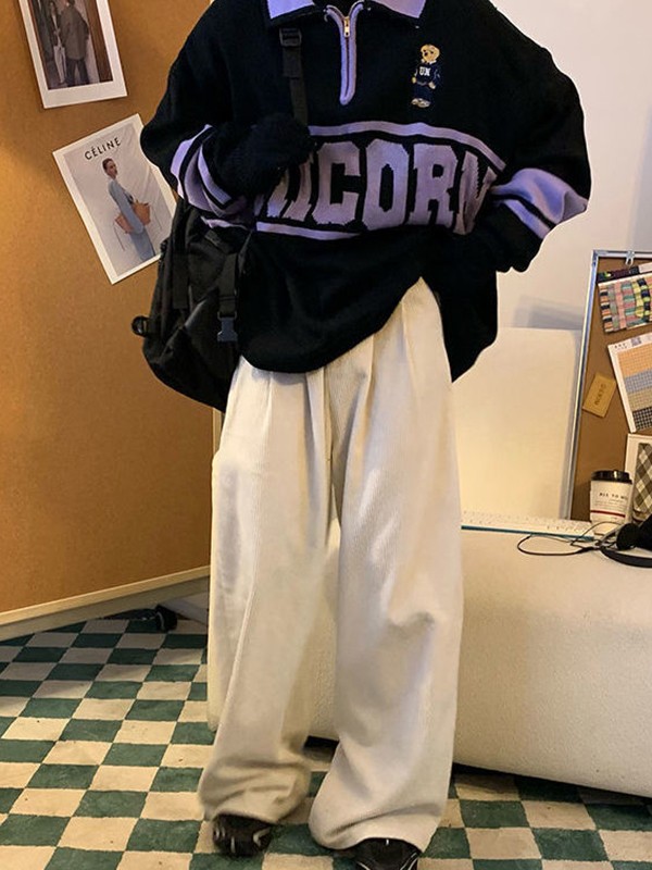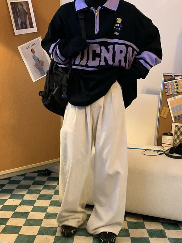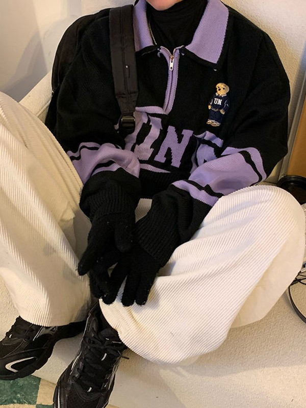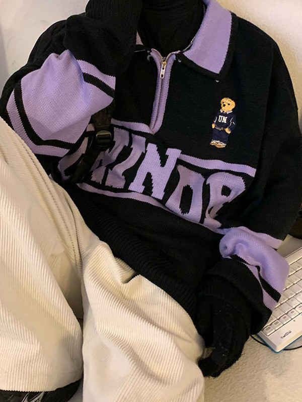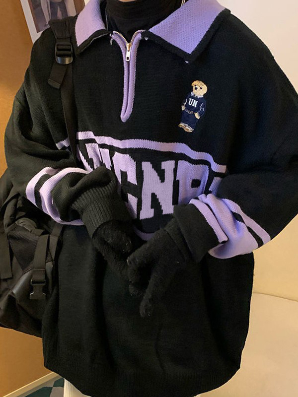 Ärmellänge: Langarm< br />Beschreibung: Auf der Suche nach Retro-inspirierten Pullovern für City-Boy-Outfits. Dieser entspannte Polo-Pullover hat einen kontrastierenden Panel-Stil, einen Buchstaben-Jacquard, einen Cartoon-Bären auf der Brust und klassische Rippendetails. Beendet mit halbem Reißverschluss-Design.